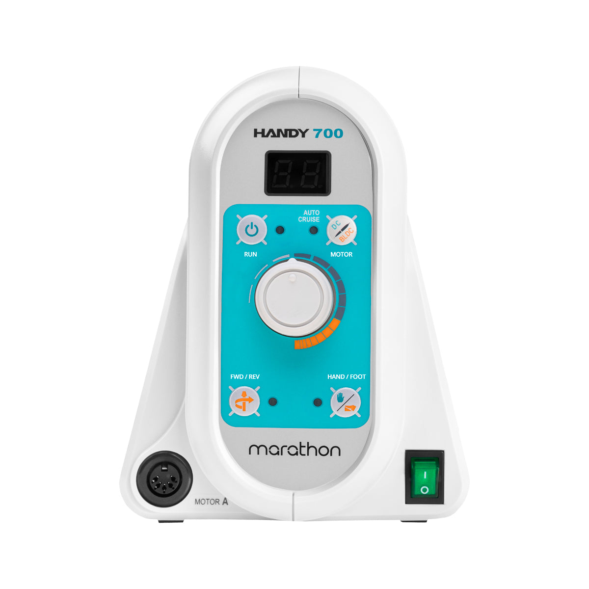 Die Handy 700 Prothesen-Nagelfräse bietet hohe Leistung von 100W und einen leisen Betrieb. Sie liefert hohe Drehzahlen bis zu 50.000 Umdrehungen pro Minute. Die Arbeit mit dieser Nagelfräse ist äußerst komfortabel, da ein Geräuschreduzierungssystem in den Mikromotor des Handstücks eingebaut wurde, das im Vergleich zu herkömmlichen Modellen um 20 % reduziert ist. Das Steuergerät der Maschine hat eine ergonomische Form, einen praktischen Griff für den Transport & einen Handstückhalter.