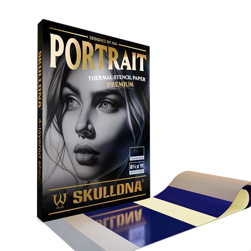 Skull DNA Portrait Schablonenpapier ist fachmännisch für Tätowierer gefertigt, die konsistente, hochwertige Bildübertragungen benötigen, insbesondere für Porträt- und Detailarbeiten. Kompatibel mit allen Thermodruckern, sorgt dieses Schablonenpapier dafür, dass Ihre Designs mit außergewöhnlicher Klarheit und Präzision reproduziert werden, was es ideal macht, um die subtilen Nuancen und feinen Linien einzufangen, die für Porträttattoos unerlässlich sind.